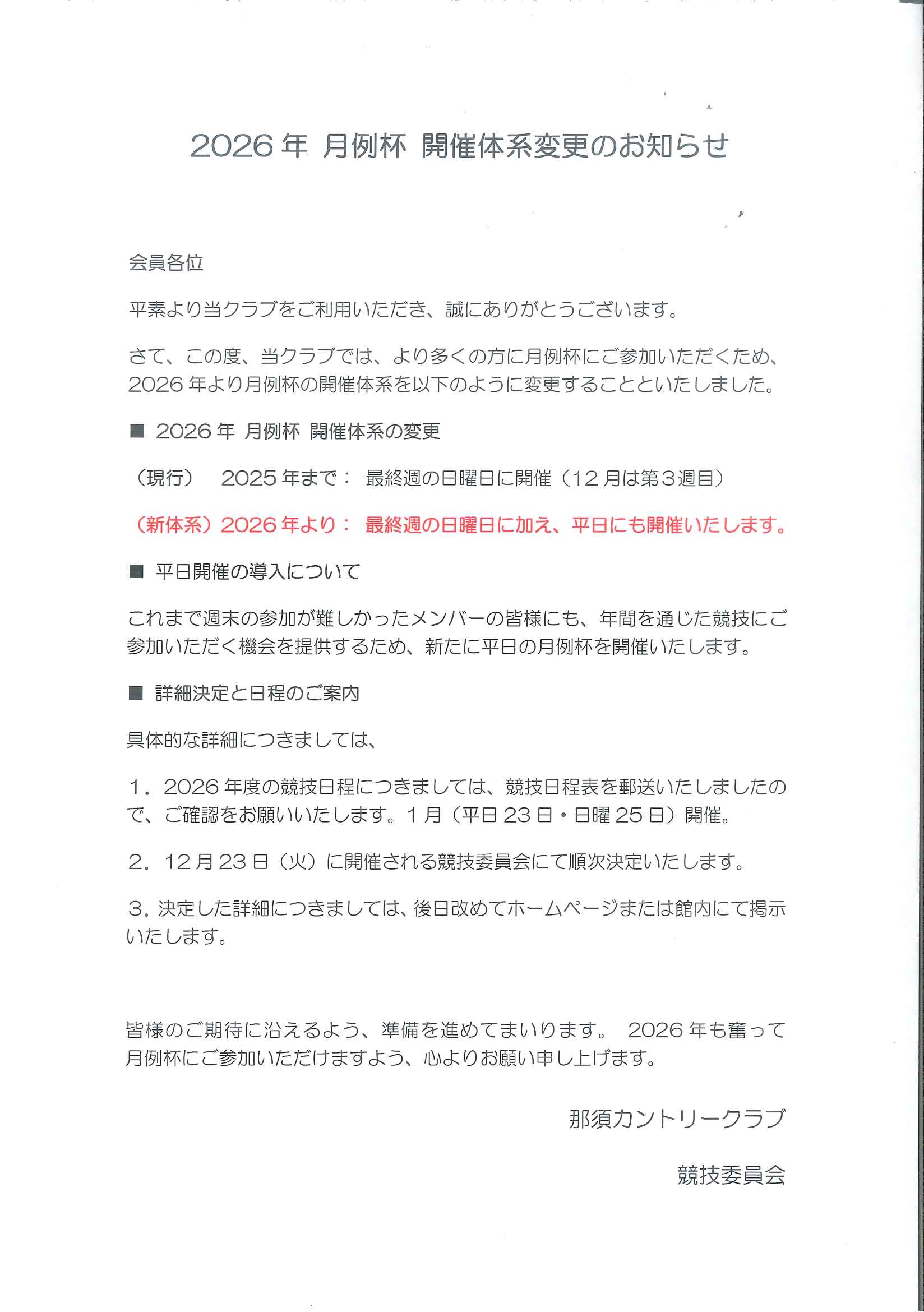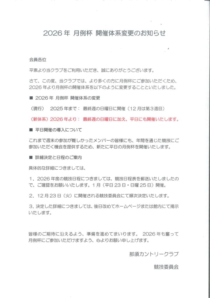 2026年月例杯開催体系変更のお知らせ