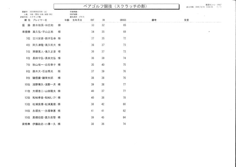 2025年9月23日に行われました「那須CCペアゴルフ競技」の結果を発表いたします。