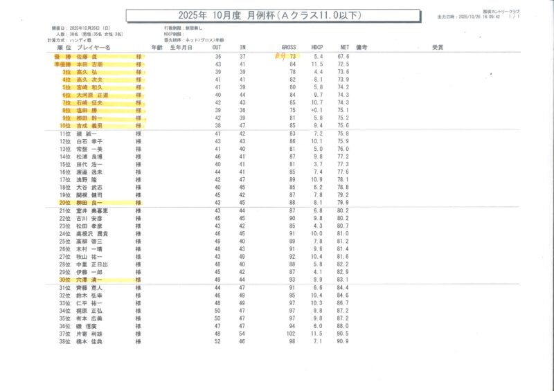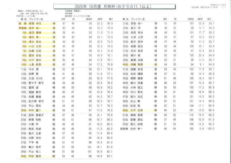 10/26(日)に行われました月例杯の競技結果をご報告いたします。