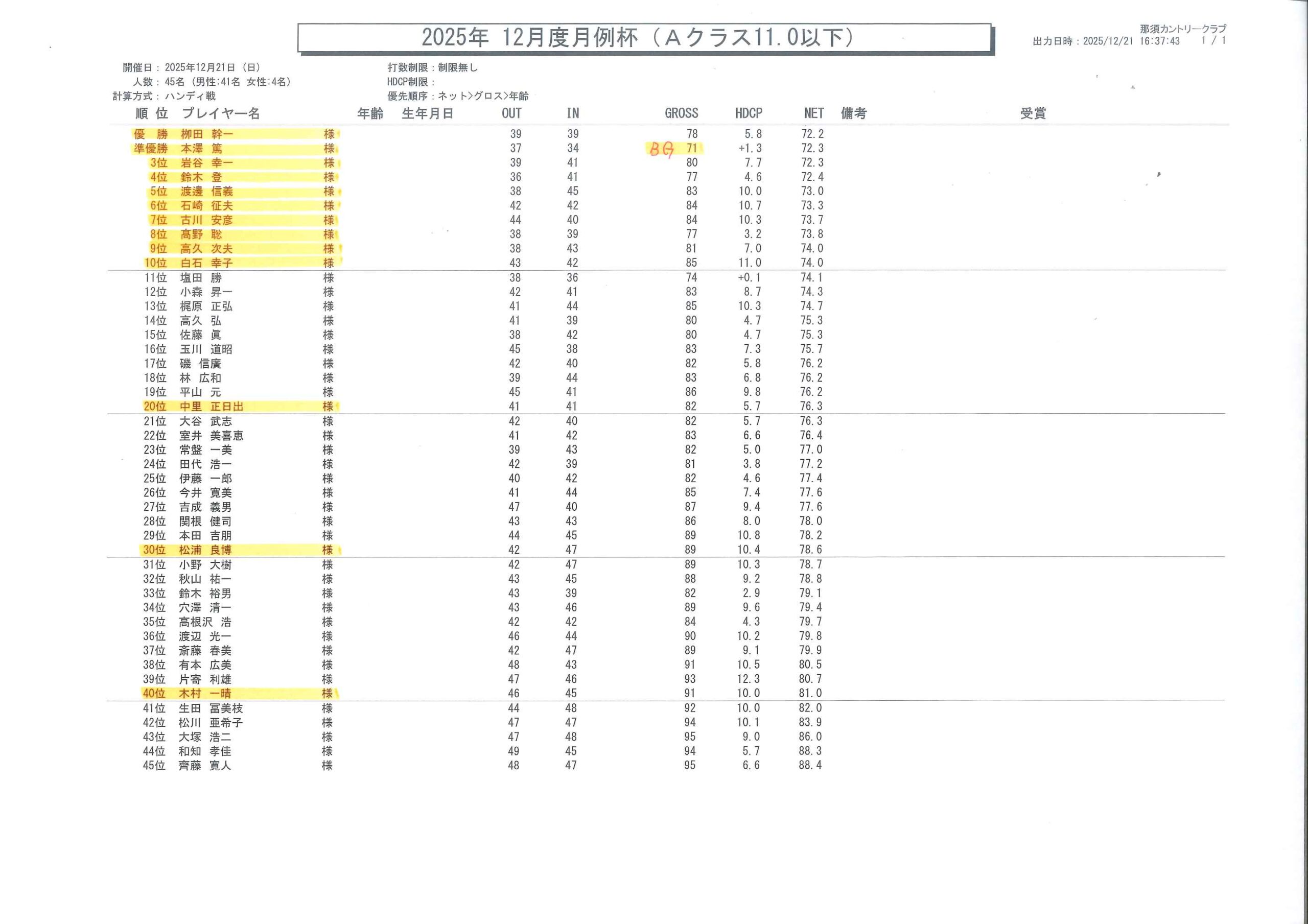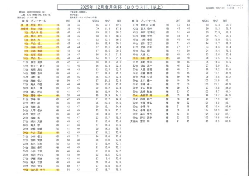 2025年12月度月例杯(競技結果) 2025/12/21 【月例】参加人数 112名 12/15(日)に行われました今年最後の月例杯の競技結果をご報告いたします。 Aクラス優勝 栁田 幹一 様 (78s) /Bクラス優勝 都築 伸五 様(85s) ベストグロス 本澤 篤 様 71ストローク! 今年1月から月例杯に継続して参加された28名の方々に皆勤賞を贈呈いたしました。 来年の月例杯は平日開催1/23(金)、日曜開催1/25(日)からとなります。 来年も皆さまのご参加お待ちしております。 « 前の記事次の記事 »一覧へ戻る