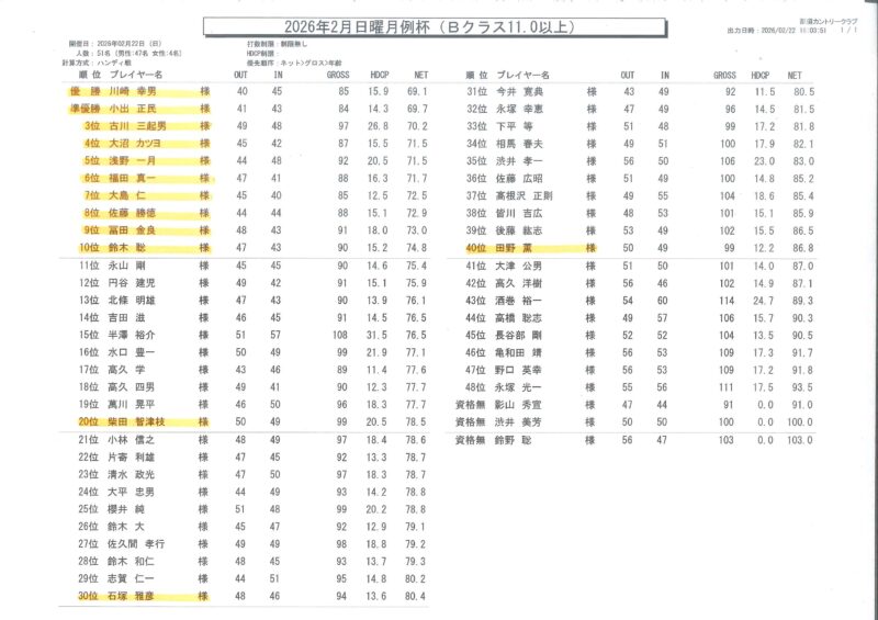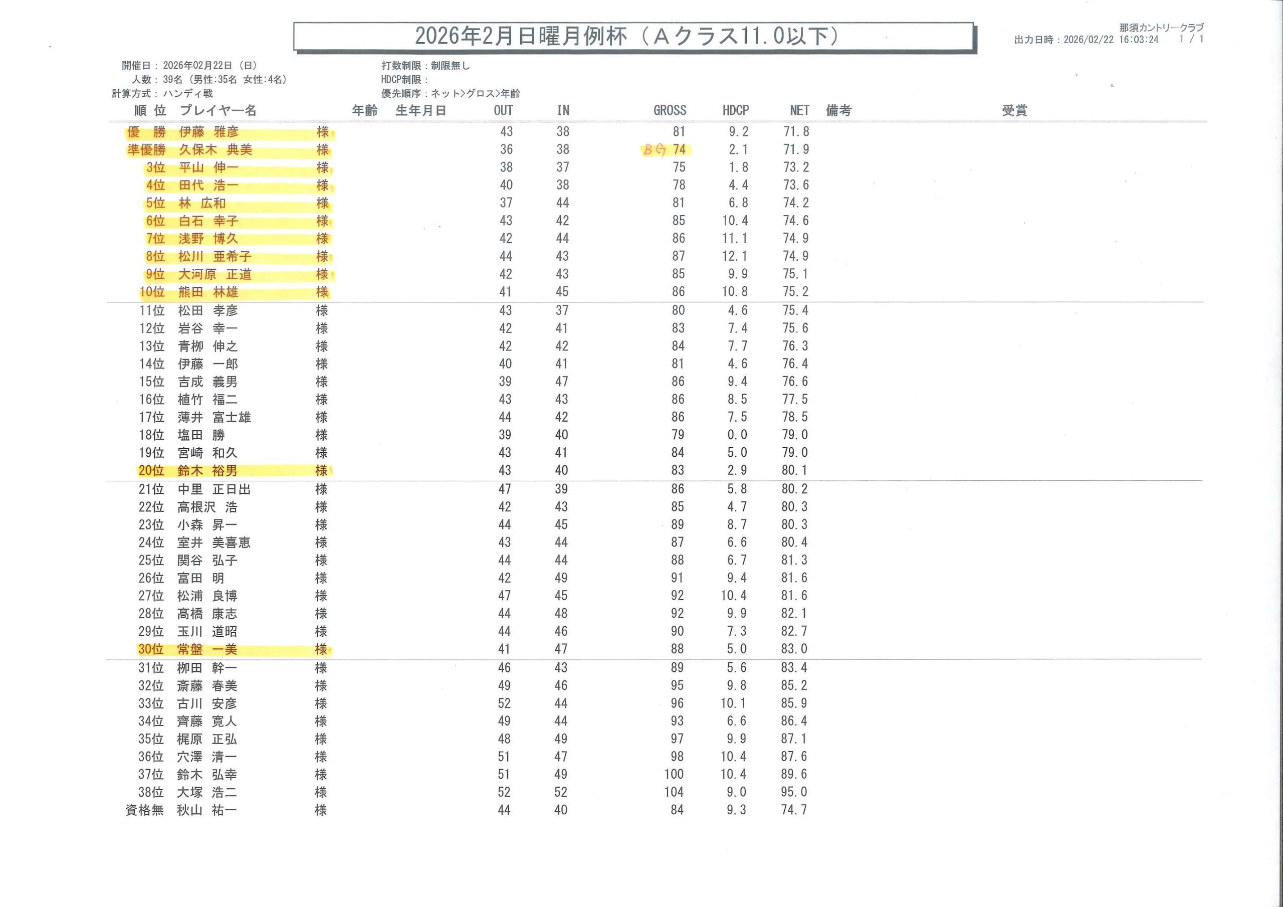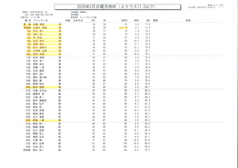 2026年2月度・日曜月例杯(競技結果) 2026/02/22 【月例】参加人数 90名 2/22(日)に行われました日曜月例杯の競技結果をご報告いたします。 Aクラス優勝 伊藤 雅彦 様(81s) Bクラス優勝 川崎 幸男 様(85s)エージシュート! ベストグロス 久保木 典美 様 74ストローク! 来月は3/29(日)と3/30(月)に月例杯が開催されます。 皆さまのご参加お待ちしております。 « 前の記事一覧へ戻る